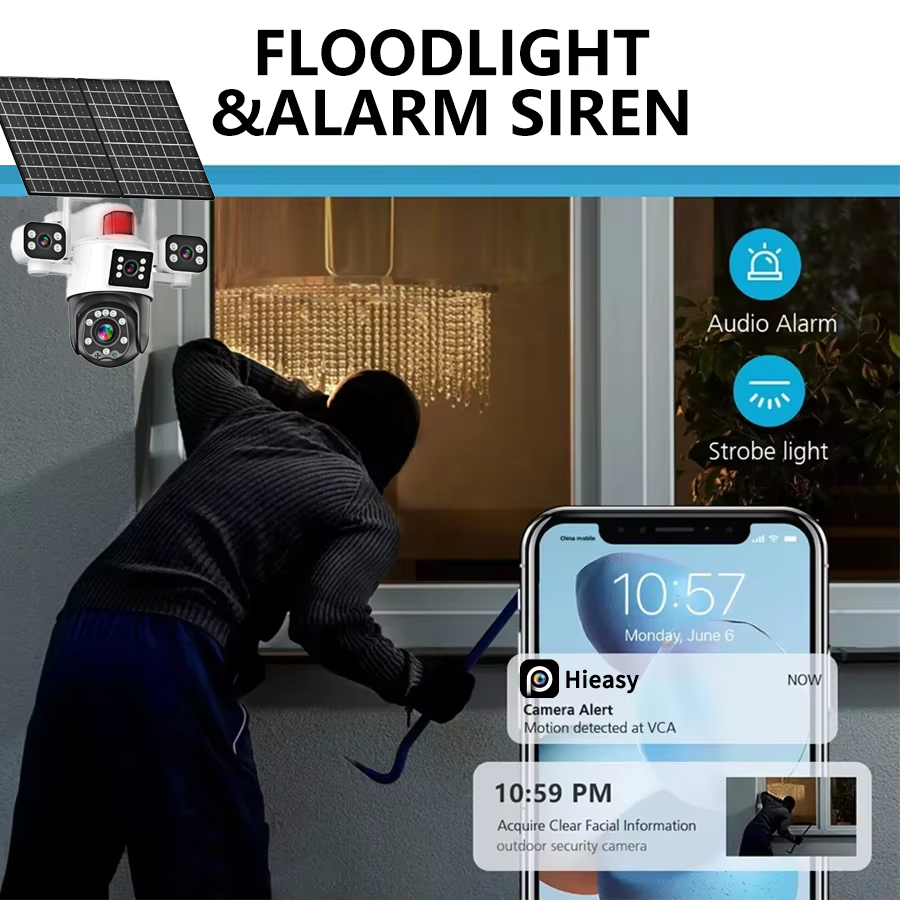 The 7X24 Hours 4G Solar-Powered Battery AOV Camera, equipped with an 8W high-efficiency solar panel and a 13,200mAh battery pack (6×18650 lithium-ion cells) for uninterrupted all-weather surveillance (even in remote/off-grid areas), offers key functions including intelligent humanoid detection & tracking (with reduced false alarms), real-time alerts (via mobile app with snapshots) & two-way voice intercom, rapid wake-up (millisecond response to capture sudden events), precision low-power management (dynamic adjustment to extend battery life and monitor power accurately), and flexible large-capacity storage (supports TF card up to 256GB and external card expansion for long-term footage retention).
