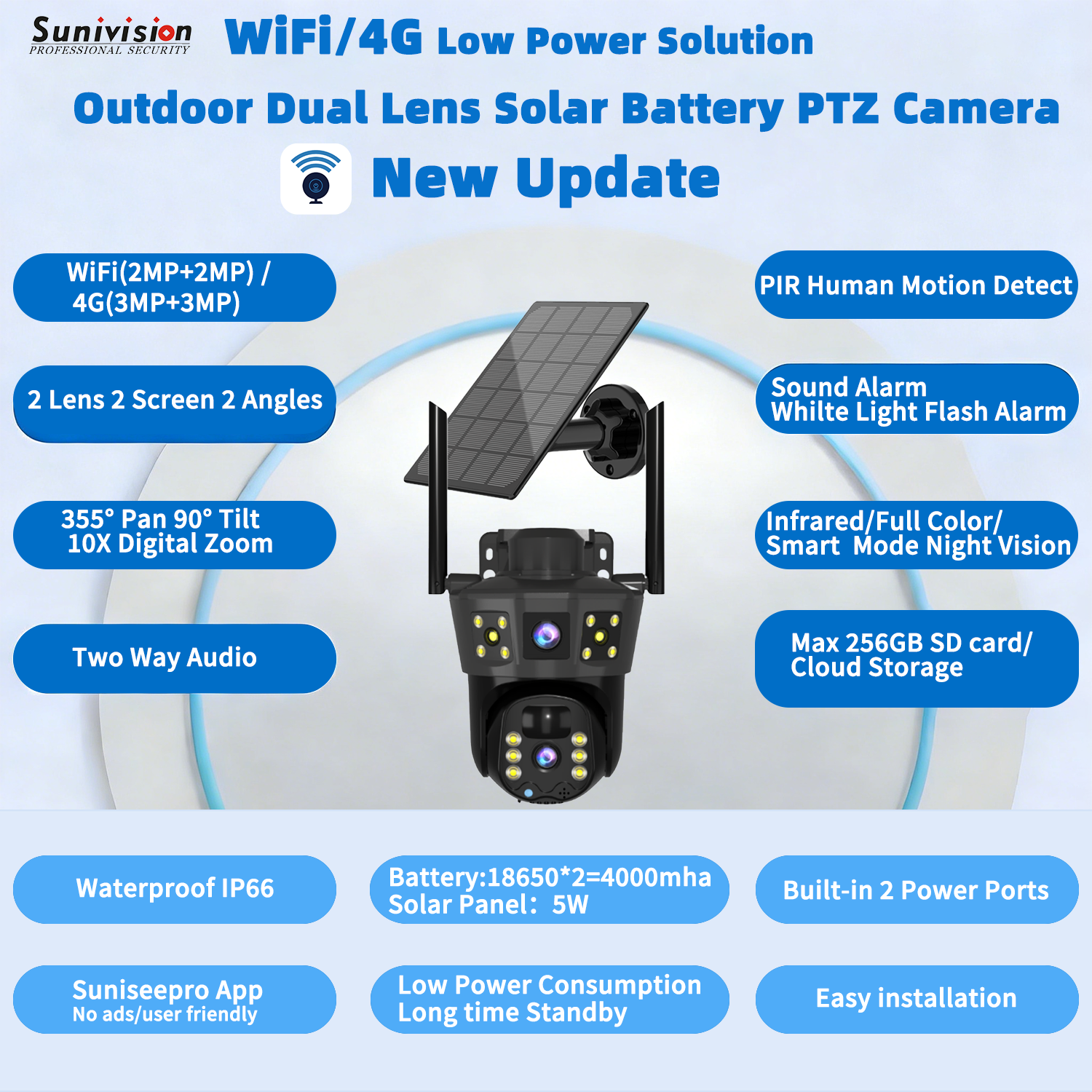 Our best-selling dual-lens solar-powered surveillance camera delivers advanced security with flexible installation and reliable performance. Built for outdoor use, it ensures comprehensive monitoring day and night, backed by smart detection and dual power options.